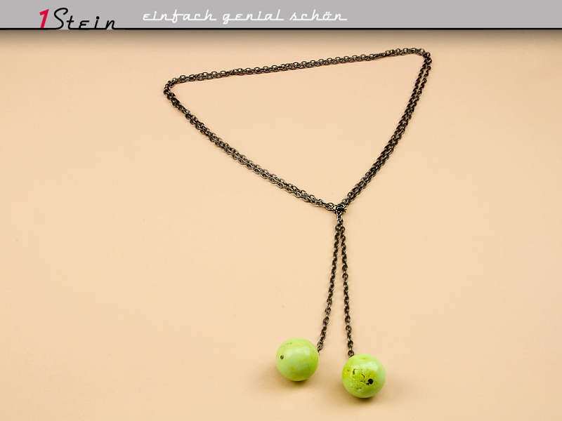 Tief anthrazitfarbene, lange Gliederkette mit zwei großen, apfelgrün gefärbten Howlith-Perlen als End"Gewichte".